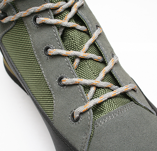 通し穴はハトメにする事で脱ぎ履き時のストレスを軽減しています。
