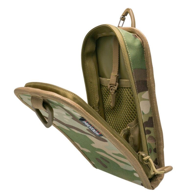 ・背面の横に2本装着された面ファスナーと上部のカラビナにより、ショルダーベルトにしっかりと装着できます。