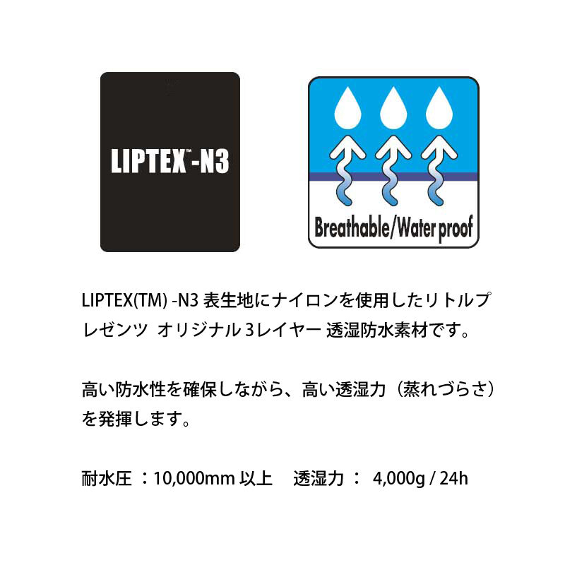 ・素材のLITTLE PRESENTS オリジナルの3レイヤー透湿防水素材LIPTEX™-N3を 使用しています。表生地にしなやかで引き裂き強度に優れたナイロンを採用した透湿力と耐久性にすぐれた素材です。