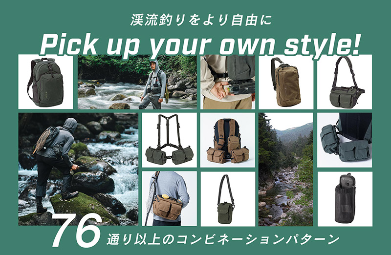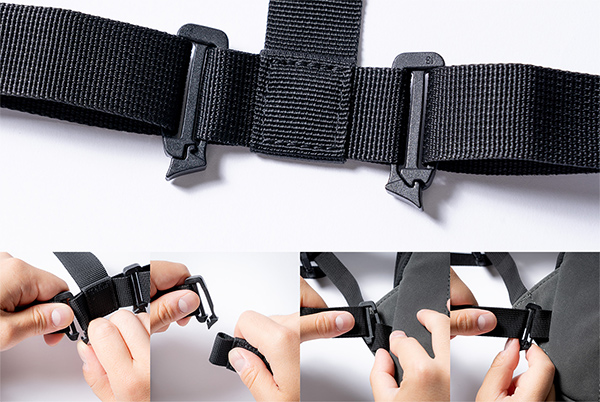 縦横に配した背面のストラップでウエストベルトやザックのショルダーハーネスに取り付け可能です。