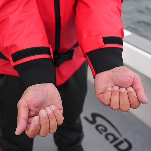 袖口はネオプレーン素材を使用した二重袖になっており、風や雨の侵入を防ぎます。パンツはサロペットタイプのものを採用。フロントにはファスナーがついているので小用の際にも便利です。今モデルから型紙からパターンを修正し、パンツのヒップ側の生地を1枚布にすることでヒップから股部にかけての引き裂き強度が各段に強くなりました。