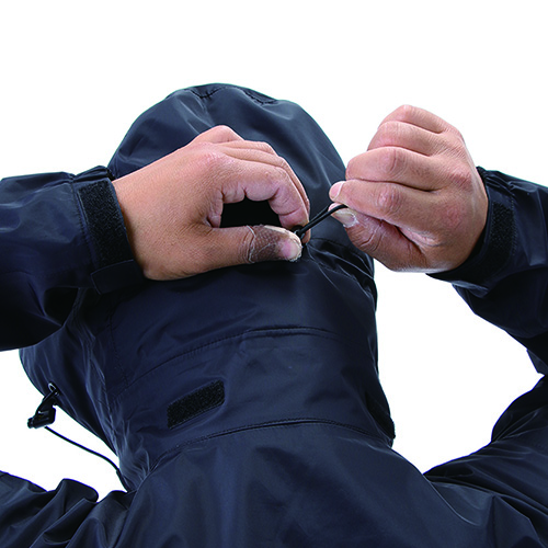 フードのヒサシ部分には芯が入り、風によって垂れ下がることを防ぎます。また、立襟と分離独立しているので、雨雫がフードを伝わって襟の内側に入ってきません。