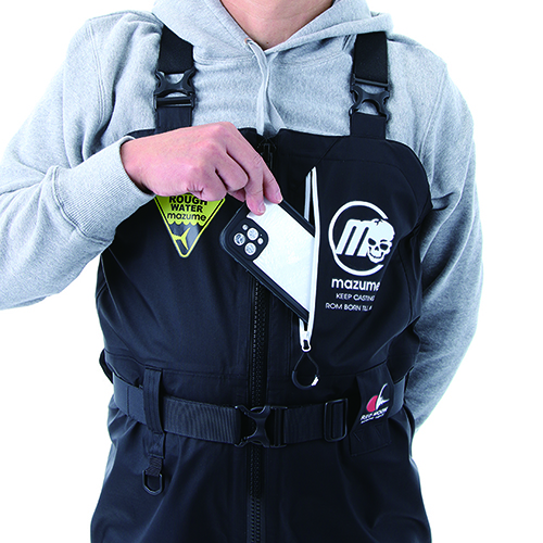 プレジャーボートに乗ってひとりで出船しているときに、万が一の落水や漂流の際には、近海であれば命綱となるスマホを身に着けていれば連絡をとることができます。だから、スマホが入る胸ポケットが必要と考えます。また、ウエストベルトを締めてタイトな状態にすれば、落水の際に泳ぎやすい状態が作れます。