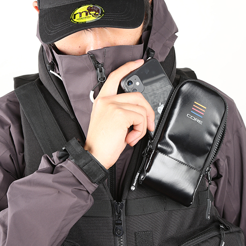 フロントポケットに定番のルアーボックスのMEIHO3010が左右に入り、ルアーフィッシングをサポートします。付属の薄型ショルダーポーチはiPhone14pro MAXがケース付きで入るサイズ感です(取り外し可能)。プライヤーホルダーも装備。