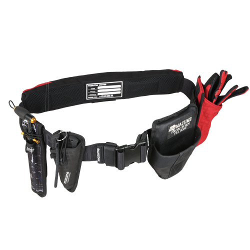 最大の特徴はmazumeが独自で開発したジャガード織りのハードベルト!一般的なライフジャケットのベルトと比較して数倍の強度、硬度を有しており、大型プライヤーやファイティングパッドを装備してもヘタりません。