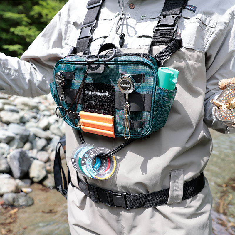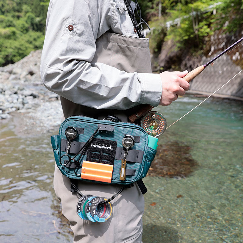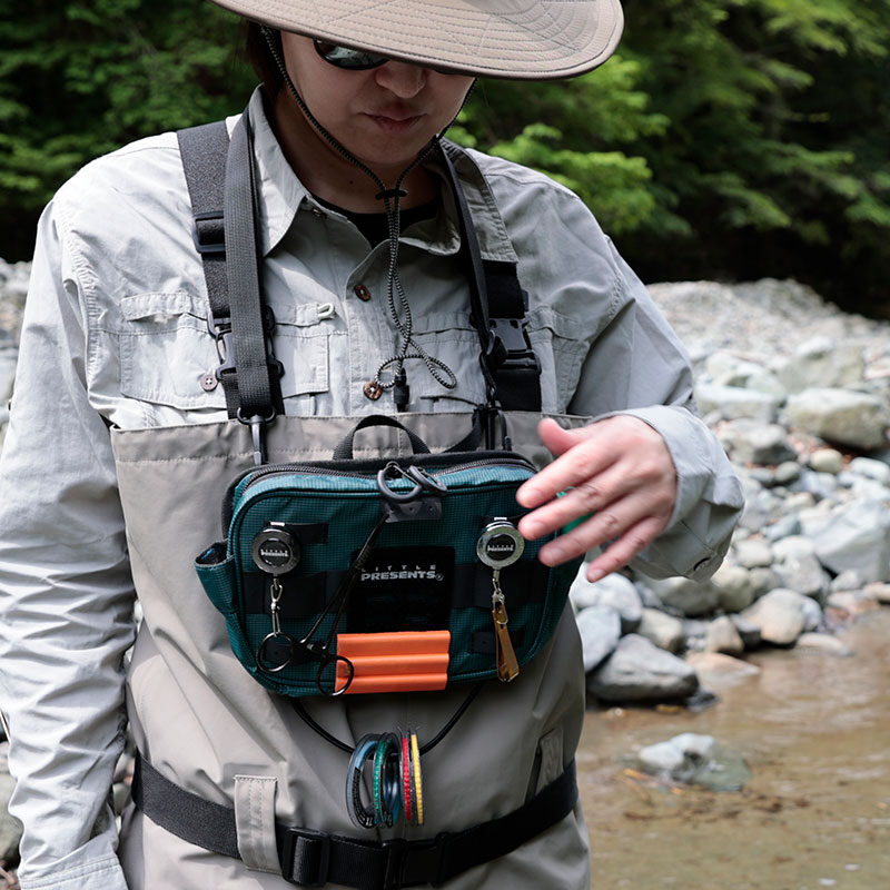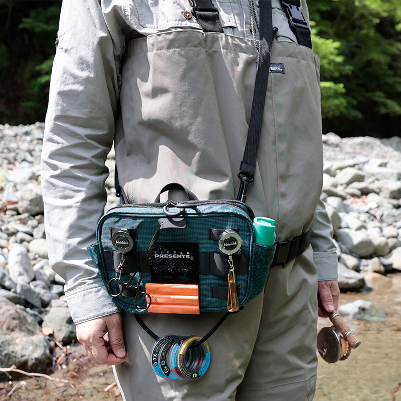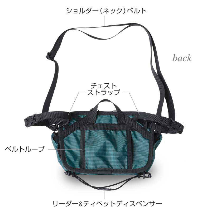 ・ペアのバンドでウエーダーのサスペンダーにセットする以外に、付属のベルトでショルダーポーチとしても、またベルトループに通してウエストポーチとして使用することも可能です。3WAYポーチです。