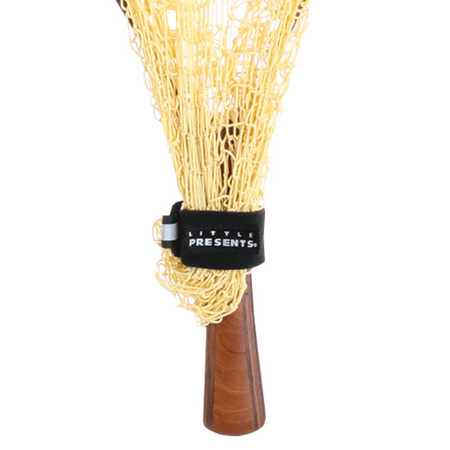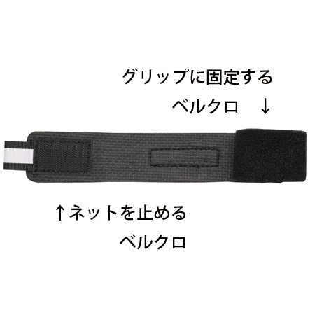 ・裏側にベルクロが2箇所装着されており、一つ目のベルクロでベルトをグリップに固定して、もう一つのベルクロでネットを束ねます。
