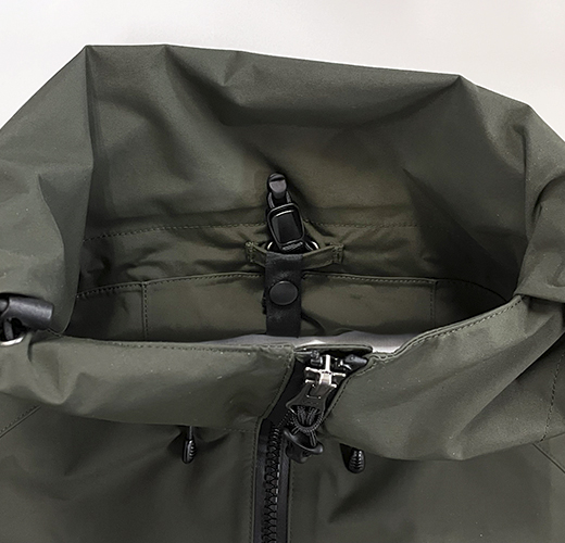 通常使用時もフードや襟元のドローコードで調整していただければサイズ感、見た目の違和感も無く着用可能です。
