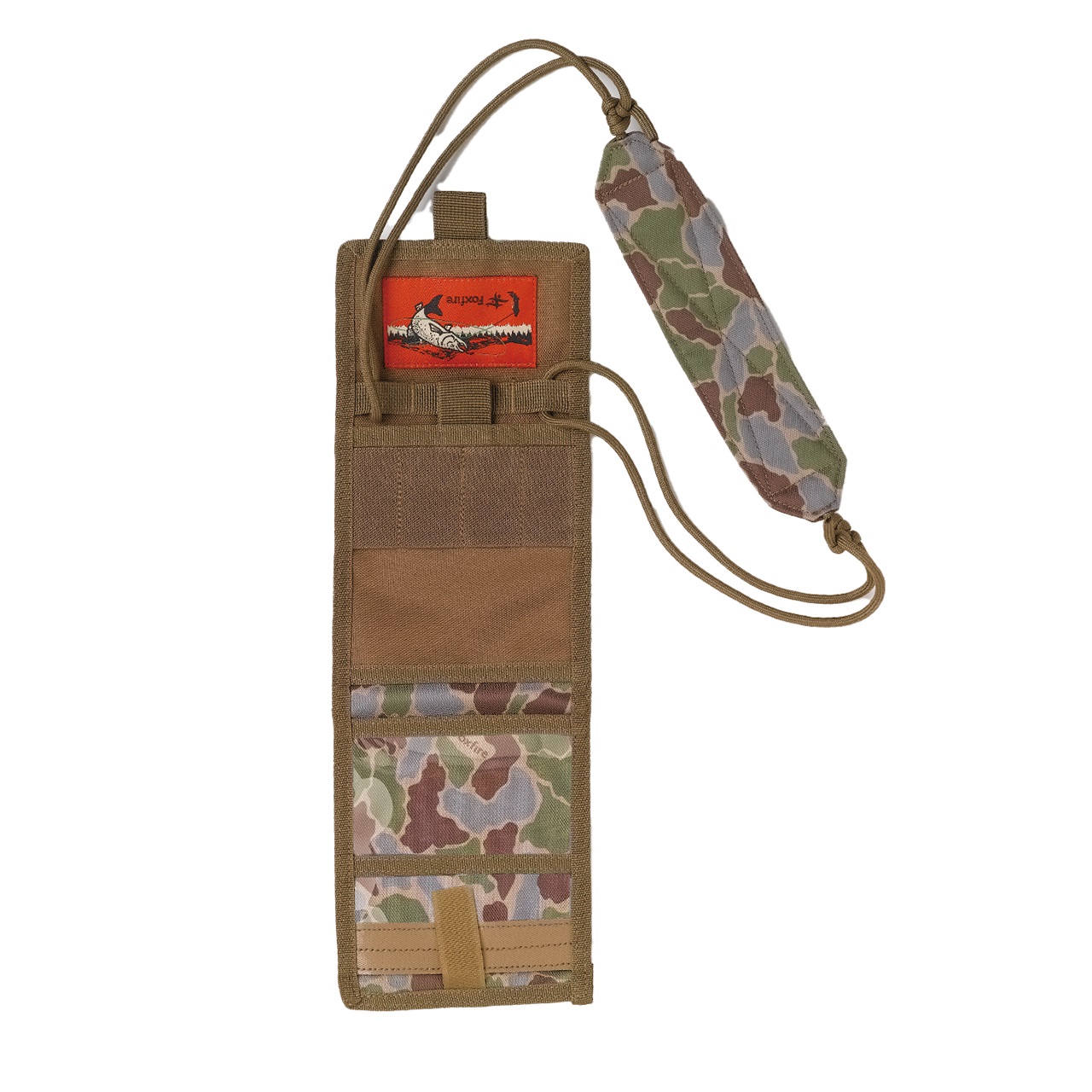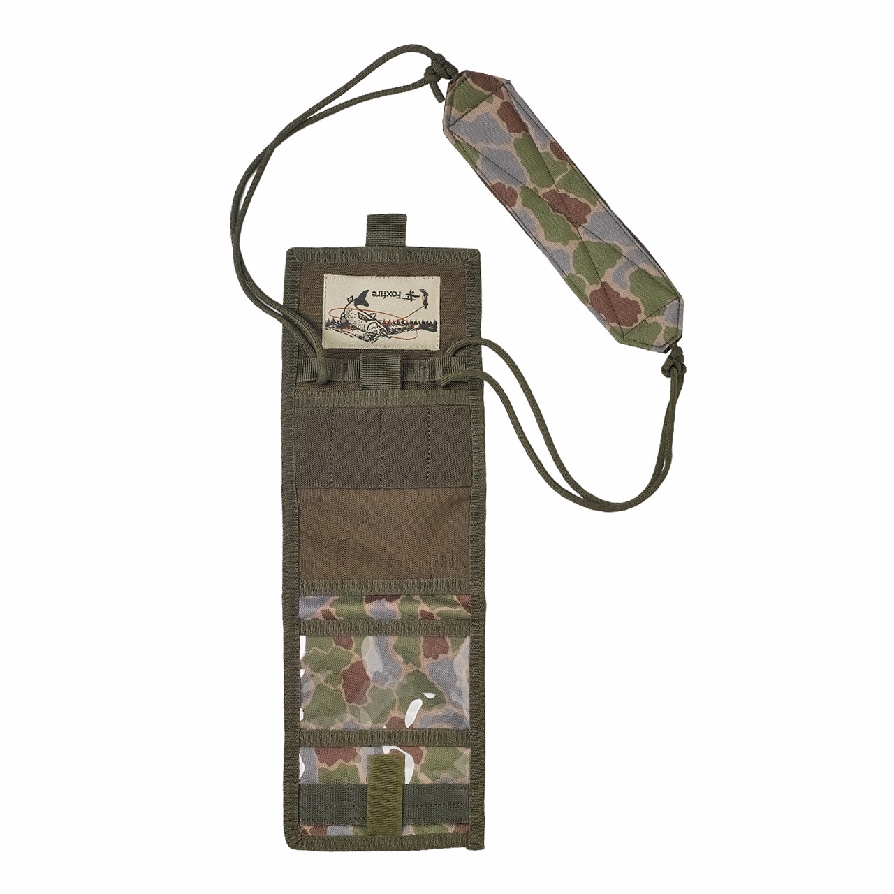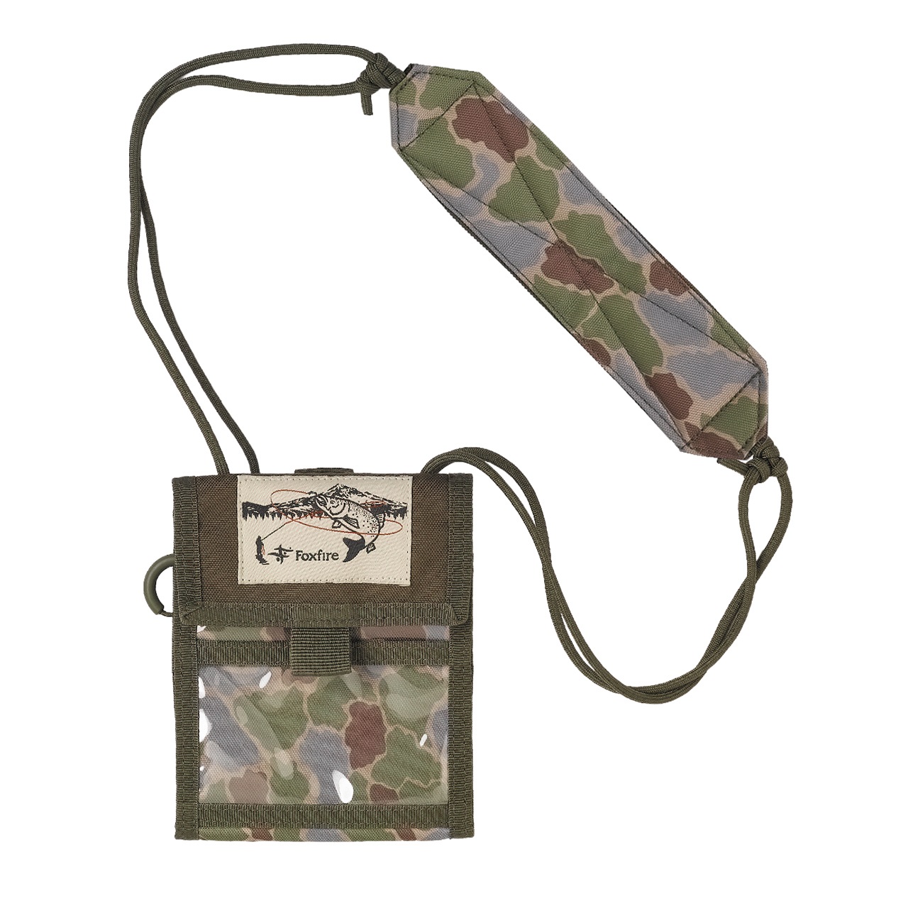 Foxfireオリジナルのフィッシュアイカモフラージュ柄をプリントした首掛けウォレット。