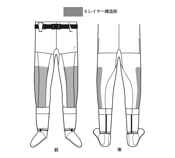 最も傷みやすい脚部前面のみに特殊6レイヤー構造を施すことにより、動きやすさや透湿性は損なわずに、耐久性も確保しています。